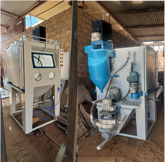 Blast cabinet is an enclosure which houses the abrasive propelling by blast suction Gun/nozzle and holds work in position and confines flying abrasives particles and dust.