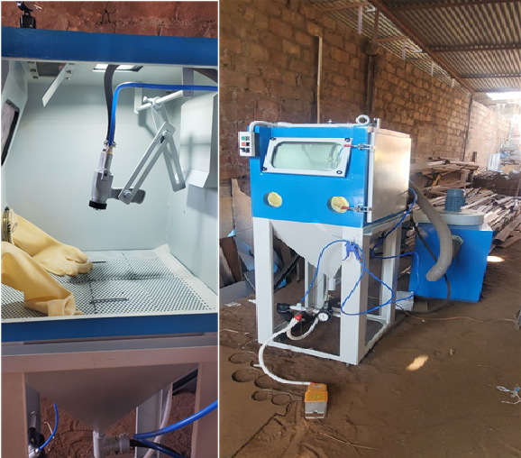 Blast cabinet is an enclosure which houses the abrasive propelling by blast suction Gun/nozzle and holds work in position and confines flying abrasives particles and dust.